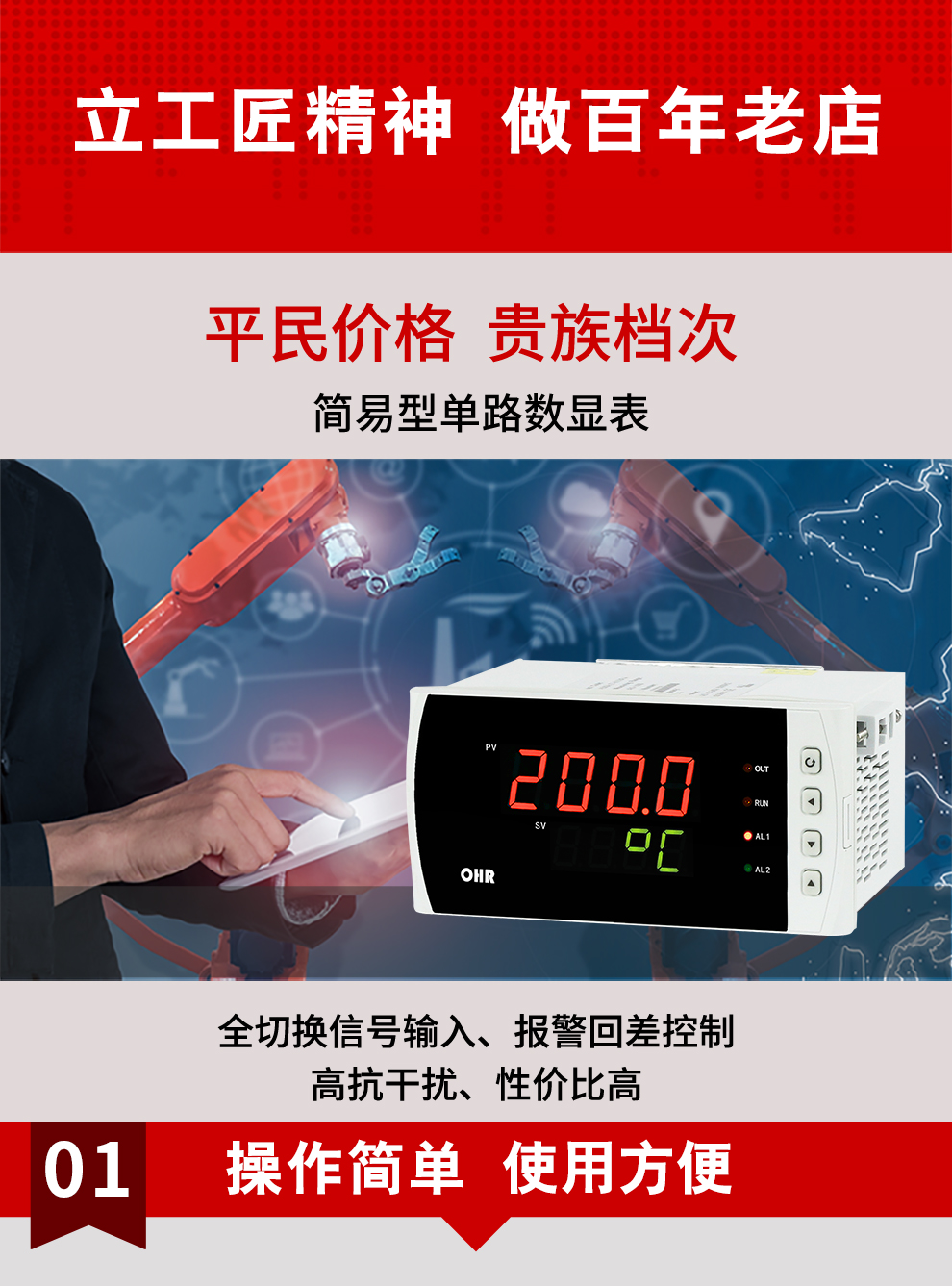 OHR-A100/A104系列簡易型單回路顯示控制儀采用模塊化結(jié)構,結(jié)構簡單、操作方便、性價比高,適用于塑料、食品、包裝機械等行業(yè)。